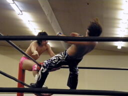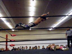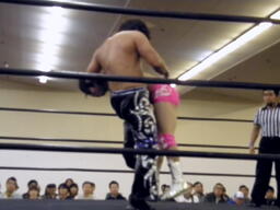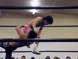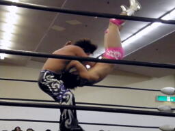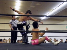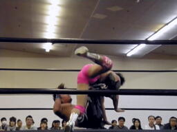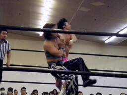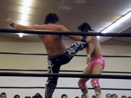 HARASHIMAボディスラム、エプロンに出てスワンダイブプレス(左写真)、カウント2。