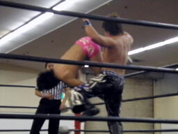 石井バック取る、HARASHIMAブレークするとソバット入れてファルコンアロー(右写真)、カウント2。