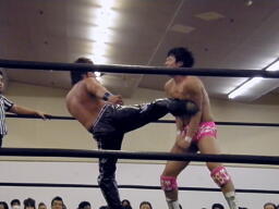 石井ニールキック、HARASHIMAキックで撃墜。石井が立ち上がろうとするところに延髄蹴り。HARASHIMAビッグブーツ(左写真)。