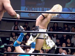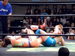 澤田足すくってレッグロック、アームロックに移行するが長井足取ってアキレス腱固め(右写真)、澤田ロープ。ロストポイント残り7。長井は佐々木にタッチ。