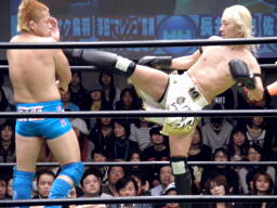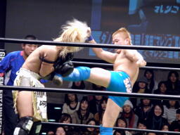 タッグなので両チームロストポイント8からスタート。先発は鳥羽と長井。ローキックの打ち合い(右写真)。長井がローキック打つと鳥羽吹っ飛んで澤田にタッチ。