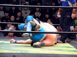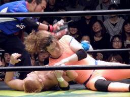 澤田アームロック(左写真)、長井ロープ。長井・佐々木組はあと1回のダウン/エスケープで負けとなる。