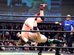 澤田切り返して変形のリバースバイパーホールド(左写真)、佐々木ロープ。ロストポイント残り6。澤田は鳥羽にタッチ。