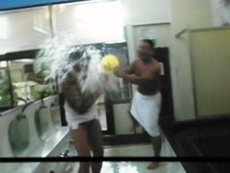高木が電気風呂に転落、松井レフェリーにも電気が!(左写真)