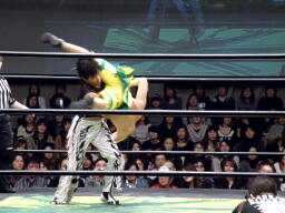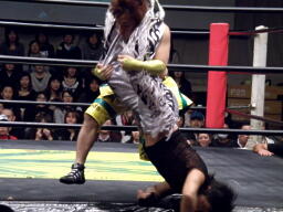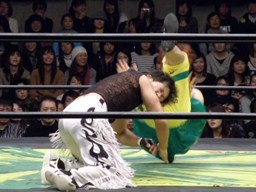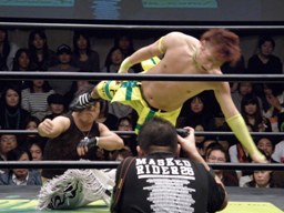 MIKAMIリング内から場外へのコルバタ狙うが失敗、エプロンに出てフランケンシュタイナーのような形で千賀を落とす(右写真)。