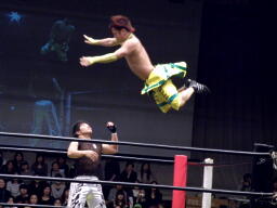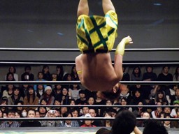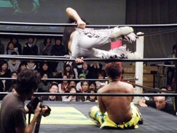 MIKAMIコーナーに上ってムーンサルトプレス(右写真)、カウント2。