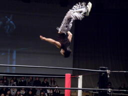 千賀トペ・コン・ヒーロ(左写真)。千賀MIKAMIをリングに戻してスワンダイブ狙うがMIKAMI阻止。