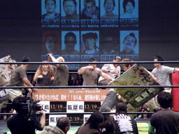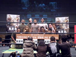 ということで急遽出場が決まった村田アナ(ドラマチックファンタジア代表)も含め10選手で記念撮影(左写真)。この試合のルールはオーバー・ザ・トップロープによる爆死でのみ失格、退場。適当なタイミングで凶器バッグが投げ込まれる、というもの。