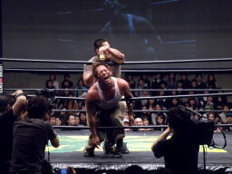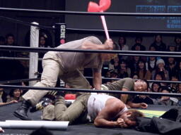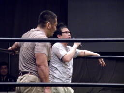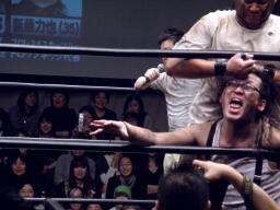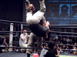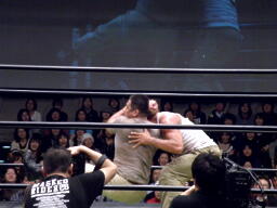 高木がマイケルをブレーンバスター(右写真)、マイケルはサードロープ下から場外へ。