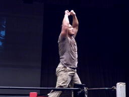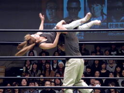 村田アナは「闘いはイヤ」とコーナーに下がって実況開始、しかしもう一人の非レスラー・新藤リングアナは大鷲に捕まる(右写真)。
