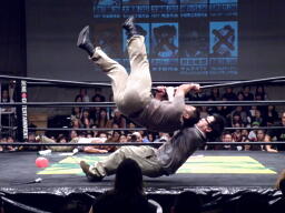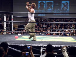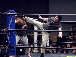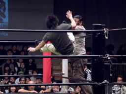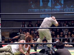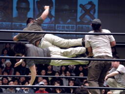 そしてダブルのドロップキック(右写真)、大鷲はトップロープを超えてエプロンに。