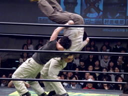 谷口が石井を持ち上げオーバー・ザ・トップロープ狙う(左写真)。