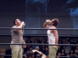 当然のように高木はスタナー(左写真)、マイケルはロックのように見事にビールを噴き上げながら後方に吹っ飛ぶ。