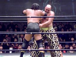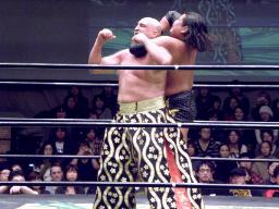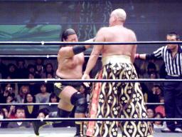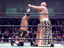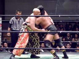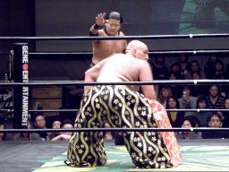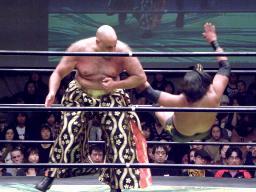 チョップの打ち合い(右写真)。星誕期首投げからボディプレス。