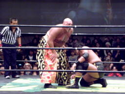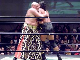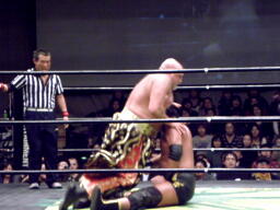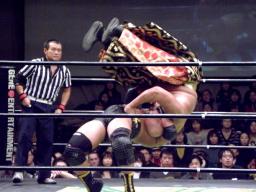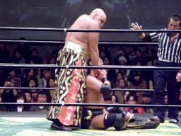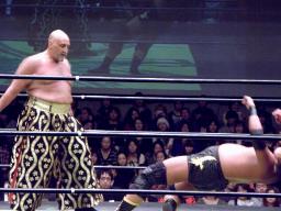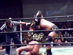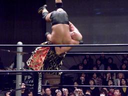 ビッグブーツの打ち合いから大鷲ドロップキック、コーナーに上ってダイビングボディプレス(右写真)、カウント2。