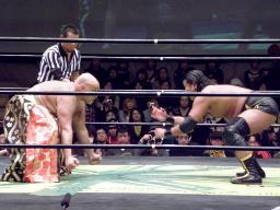 相撲出身対決とあって星誕期は蹲踞の姿勢を取るが、大鷲はそれを拒否して手四つに(右写真)。