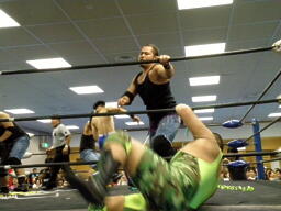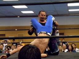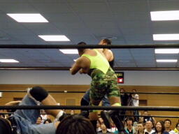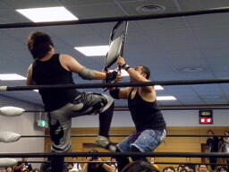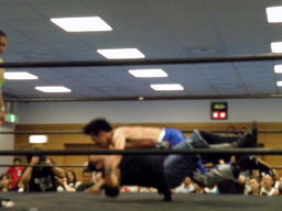 今井逆エビ(右写真)、入江がカット。ヒデがしつこく攻撃する入江を場外に出す。今井ダブルニードロップ。