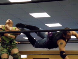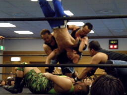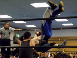 今井ロープに飛ぶ、宮本カウンターで大外刈り(右写真)。入江が笠木をおんぶして合体式テディベア、ヒデがカット。