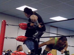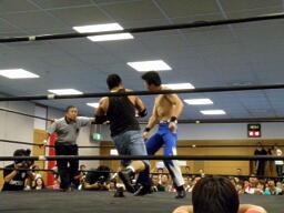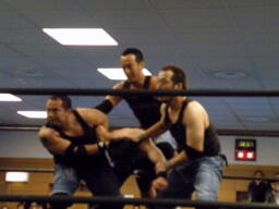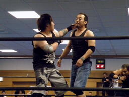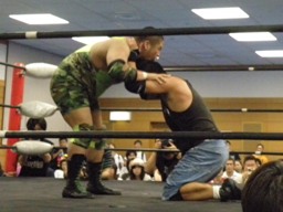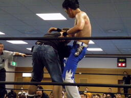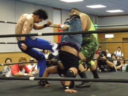 入江3人に次々にエルボー(右写真)。ヤスと今井がダブルでロープに振ってクローズライン、入江ブレークするとそのままの勢いでヒデにショルダーブロック。