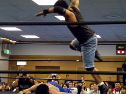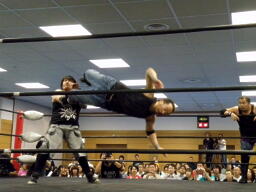 ヤスロープに飛ぶ、笠木ラリアット、ヤスかわしてドロップキック(左写真)。ヤスコーナーに振る、笠木切り返す、ヤスはサマーソルトキック、着地すると笠木をヒップトス。ヒデにタッチ。笠木も宮本にタッチ。