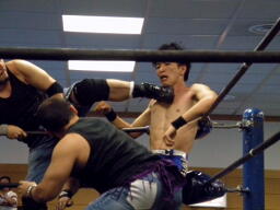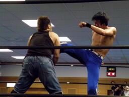 入江ロープに振ってラリアット狙う、ヤスかわしてチンクラッシャー(左写真)、トラースキック、今井にタッチ。入江も笠木にタッチ。