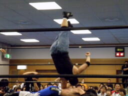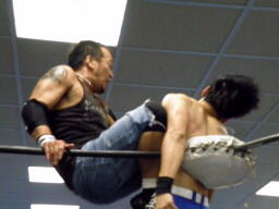 コーナーで踏み付け(左写真)、今井にタッチ。今井逆水平3連打、シュミット流バックブリーカーからボディプレス、カウント2。5分経過。