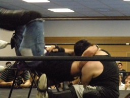 笠木はイスをセットしてその上にクレイドル・ショックで叩きつける(右写真)。クボブラが2人でカット。宮本とヤスにタッチ。