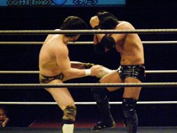 佐藤が飛行機投げで投げて逆にフロントネックロック(右写真)。