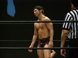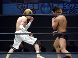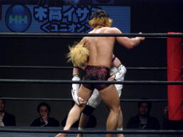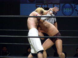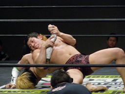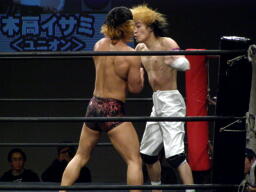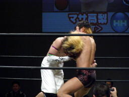 高梨首固め、イサミつぶして十字狙い、高梨上体起こしてブロック(左写真)。