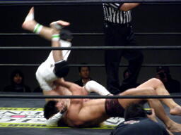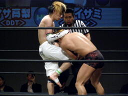 イサミが回転して逃げようとすると逆さ押さえ込みに(右写真)、カウント2。
