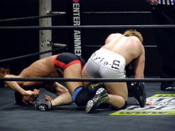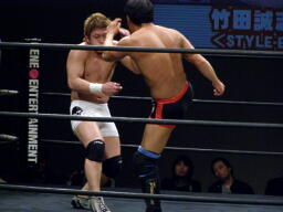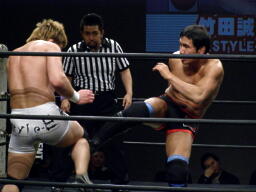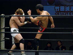 竹田ヒザ固め(左写真)、冨宅切り返してヒールホールド、竹田ブレークして立ち上がる。5分経過。