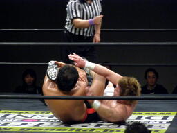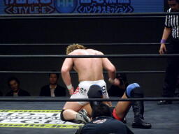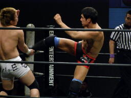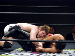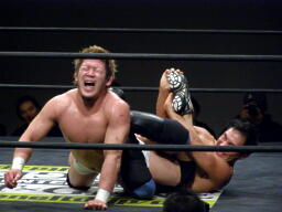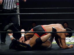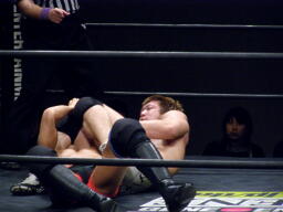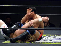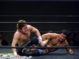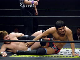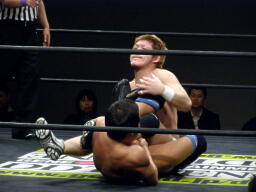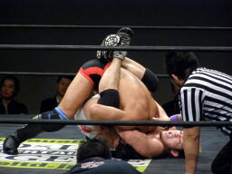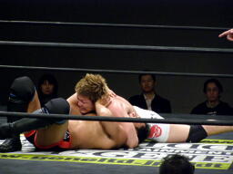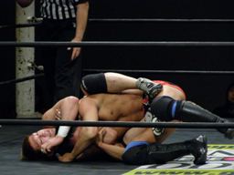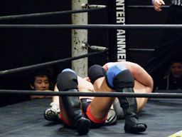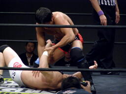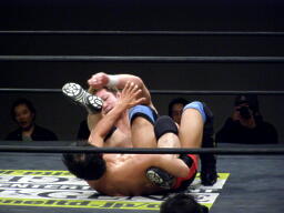 冨宅切り返してアンクルホールド(右写真)、両者の体がロープから出かかったためロープブレーク。