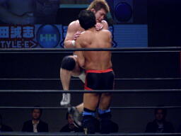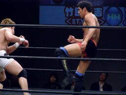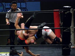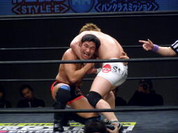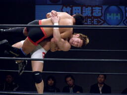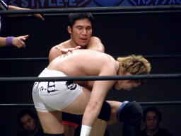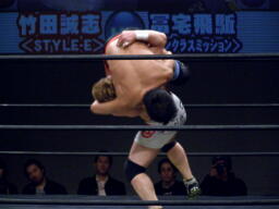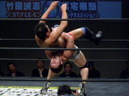竹田掌底からジャーマン(右写真)、冨宅ダウン。カウント8で立つ。冨宅ロストポイント1。