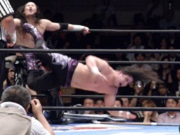 バラモン兄弟によるダブルのブレーンバスターをJOEブロック、柏がJOEに回転エビ(左写真)、その勢いでJOEのブレーンバスターも成立。