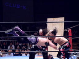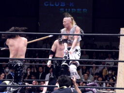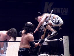 今度は竹刀でのチャンバラからシュウかケイがPSYCHOにドロップキック(右写真)、場外に落とす。代わりに柏とStormがリングイン。