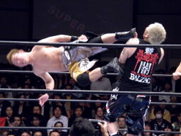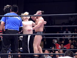 ロックアップ、KAZMAがロープに押し込むがブレーク。再度ロックアップ、今度はMAZADAがロープに押し込みブレーク際にチョップ。KAZMAとMAZADAはエルボーの打ち合いから逆水平の打ち合い(右写真)。