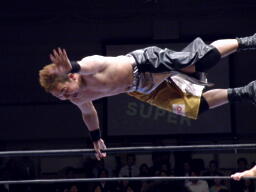 梶コーナーに振る、NOSAWA切り返して突っ込む、梶かわしてホイップ、ドロップキックに行くがNOSAWAスカす。NOSAWAロープに飛ぶ、梶カウンターのドロップキック、NOSAWA場外転落。梶はプランチャ(左写真)。KAZMAとMAZADAがリングイン。