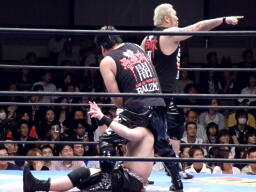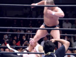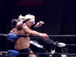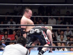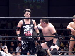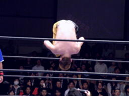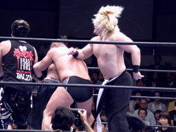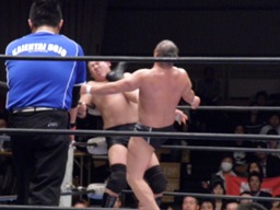 KAZMAショルダーブロックで吹っ飛ばし(左写真)ボディスラム。MAZADAはコーナーに逃げ帰り鈴木にタッチ。KAZMAも真霜にタッチ。5分経過。