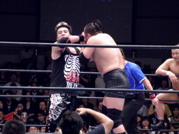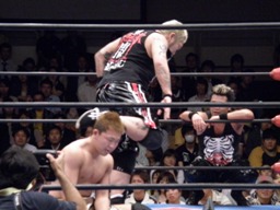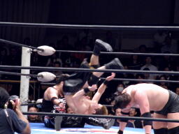 鈴木がエルボースタッブ、NOSAWAとMAZADAがダブルでロープに振ってNOSAWAがカニばさみ、MAZADAがギロチンドロップ(右写真)、顔面ドロップキック。鈴木も入って顔面チョン蹴り。MAZADAにタッチ。MAZADAカバー、カウント2。スリーパー、KAZMAがカット。鈴木ドロップキック。MAZADA張り手からカバー、カウント2。NOSAWAにタッチ。