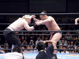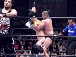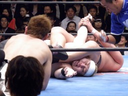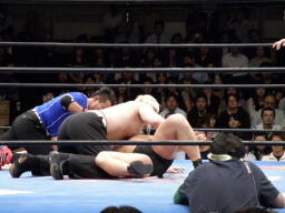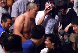 梶を捕らえてフェースロック(右写真)。しかし主役の2人が場外で大乱闘してるのでMAZADAもあんまりやる気なし。