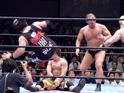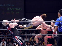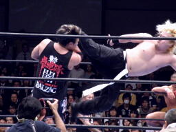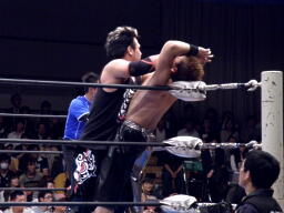 NOSAWAロープに振ってラリアット、梶かわすとセカンドロープに飛び乗って反転ドロップキック(右写真)。MAZADAがタッチを阻止するが梶はドロップキック、KAZMAにタッチ。