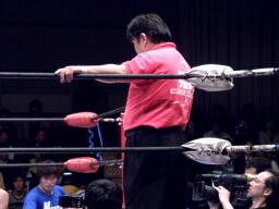サスケガットショット、エルボー、逆水平。コーナーに振って突っ込むがTAKAかわす。TAKAショルダーブロック、ロープに飛ぶ、サスケはリバースエルボーアタック(右写真)、TAKA場外転落。サスケは飛ぶふり、ロープ際で留まる。