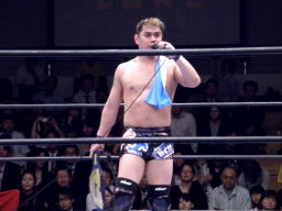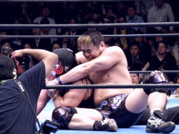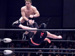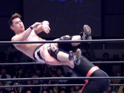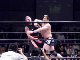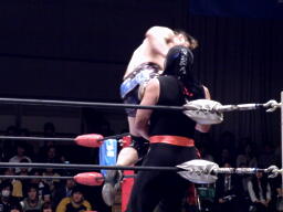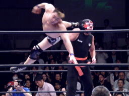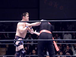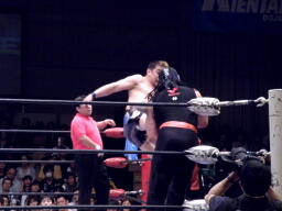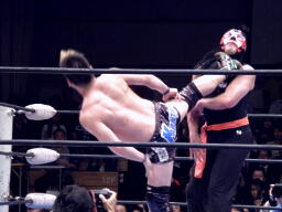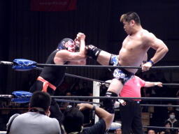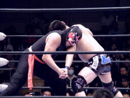 サスケローキック、ソバット、TAKAかわす。TAKAが腕を取る(左写真)、サスケ切り返してヘッドロック、TAKAロープに下がってブレーク。TAKAフロントネックロック、サスケ持ち上げてマットに叩きつける。