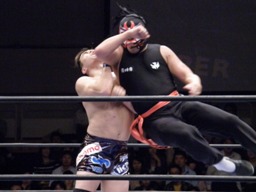 サスケロープに振るがTAKAは切り返してジャスト・フェースロック(左写真)、サスケロープ。TAKAはみちドラ狙う、サスケブロックしてマッハ!!!。