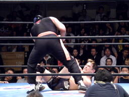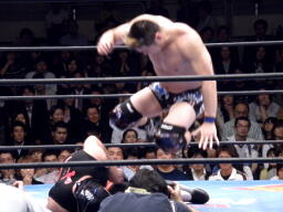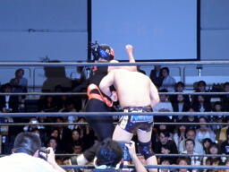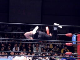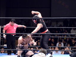 サスケボディスラム、コーナーに上ってラム・ジャム(左写真。映画「レスラー」の主人公「ラム」の技だそうだ)、カウント2。