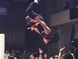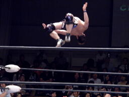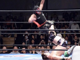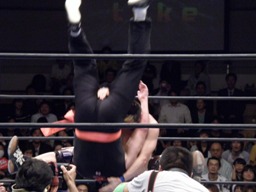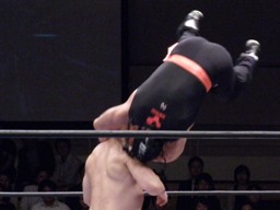 サスケジャーマン、TAKA着地。サスケハイキックからジャーマン(右写真)、カウント2。20分経過。