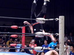 TAKAトップロープに飛び乗る、サスケ突き落とす。サスケエプロンに出てケブラーダ狙うがTAKAが足を引っ張る。TAKAがエプロンに、サスケが足を引っ張る。サスケリングに戻り助走を付けて逆トペ(左写真)。