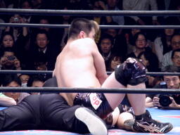 そして足4の字固め(左写真)。サスケは猪木張りに「絞ってみろ!」と挑発。サスケ一旦引っくり返すがTAKA元に戻す。サスケ転がってロープ。10分経過。