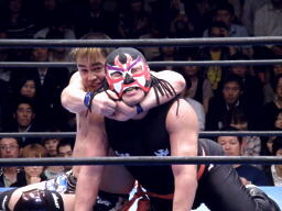 TAKAをリングに戻すとサスケはコーナーからダイブしてスリングショットネックブリーカー(右写真)、カウント2。サスケセントーン・アトミコ、TAKAかわしてロープに飛ぶ、サスケトペ・レベルサ、TAKAエプロンに。