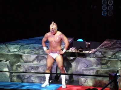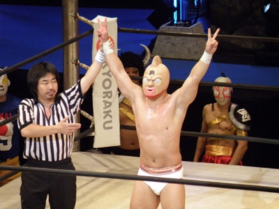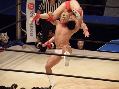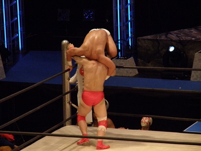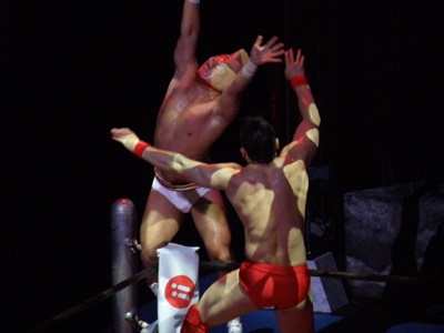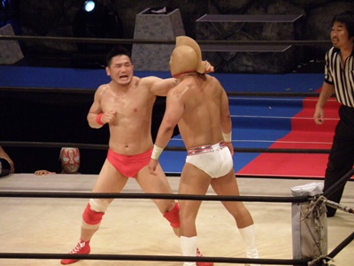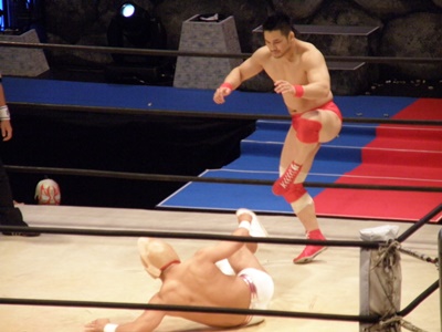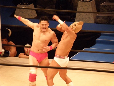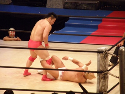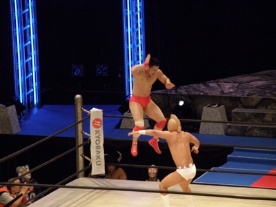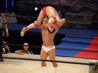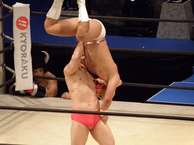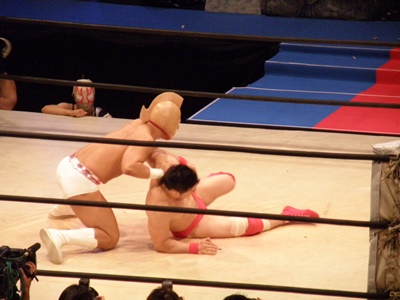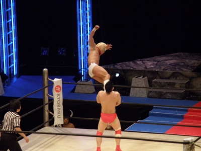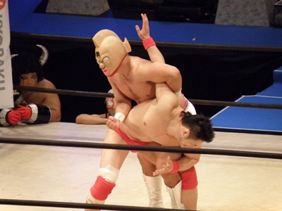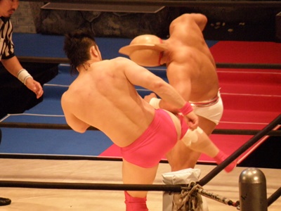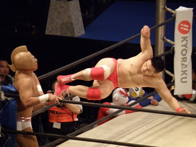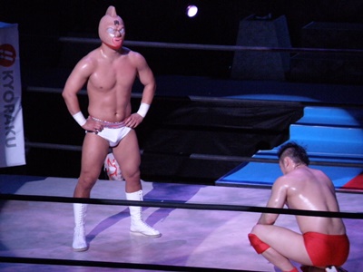 キン肉マンアリキック、美濃輪かわす(左写真)。なんでキン肉マンは白パンなんだろう?